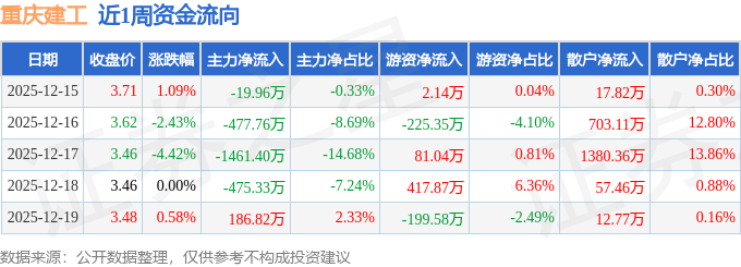 资金流向数据方面,本周重庆建工主力资金合计净流出2247.64万元,游资资金合计净流入76.12万元,散户资金合计净流入2171.51万元。本周资金流向一览见下表: