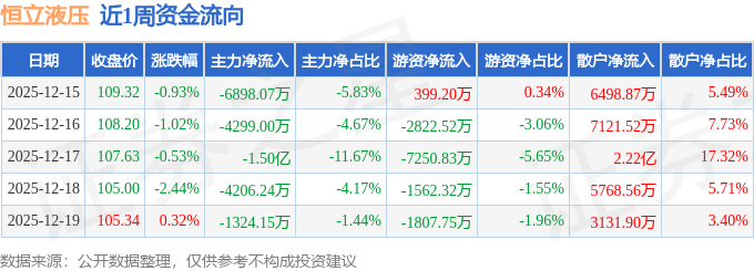 证券之星消息,截至2025年12月19日收盘,恒立液压(601100)报收于105.34元,较上周的110.35元下跌4.54%。本周,恒立液压12月15日盘中最高价报112.4元。12月19日盘中最低价报104.0元。恒立液压当前最新总市值1412.42亿元,在工程机械板块市值排名2/28,在两市A股市值排名116/5174。
