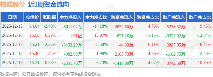 资金流向数据方面,本周柏诚股份主力资金合计净流出4614.7万元,游资资金合计净流入2650.5万元,散户资金合计净流入1964.2万元。本周资金流向一览见下表: