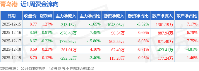 资金流向数据方面,本周青岛港主力资金合计净流出3000.06万元,游资资金合计净流入125.7万元,散户资金合计净流入2874.36万元。本周资金流向一览见下表: