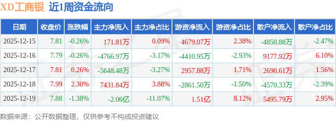 资金流向数据方面,本周工商银行主力资金合计净流出2.34亿元,游资资金合计净流入1.55亿元,散户资金合计净流入7943.1万元。本周资金流向一览见下表: