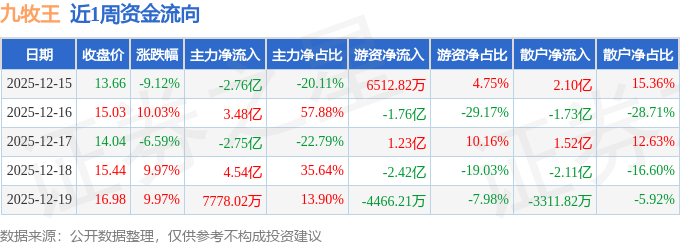资金流向数据方面,本周九牧王主力资金合计净流入3.3亿元,游资资金合计净流出2.75亿元,散户资金合计净流出5459.33万元。本周资金流向一览见下表: