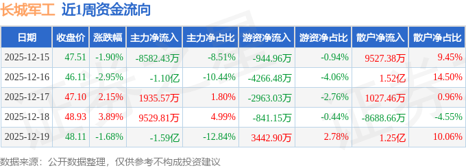 资金流向数据方面,本周长城军工主力资金合计净流出2.4亿元,游资资金合计净流出5572.72万元,散户资金合计净流入2.95亿元。本周资金流向一览见下表: