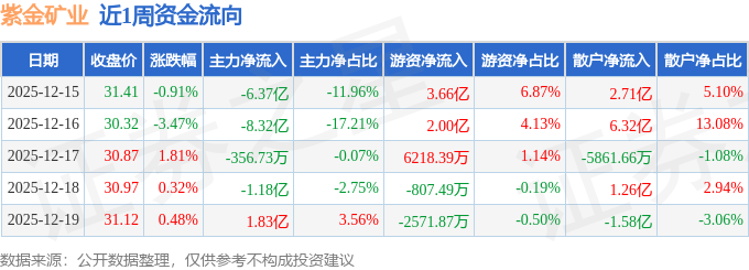 证券之星消息,截至2025年12月19日收盘,紫金矿业(601899)报收于31.12元,较上周的31.7元下跌1.83%。本周,紫金矿业12月15日盘中最高价报31.88元。12月16日盘中最低价报30.12元。紫金矿业当前最新总市值8274.72亿元,在工业金属板块市值排名1/60,在两市A股市值排名16/5174。
