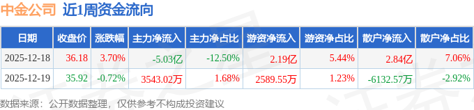 证券之星消息,截至2025年12月19日收盘,中金公司(601995)报收于35.92元,较上周的34.89元上涨2.95%。本周,中金公司12月18日盘中最高价报38.38元。12月19日盘中最低价报35.38元。中金公司当前最新总市值1733.95亿元,在证券板块市值排名7/50,在两市A股市值排名88/5174。