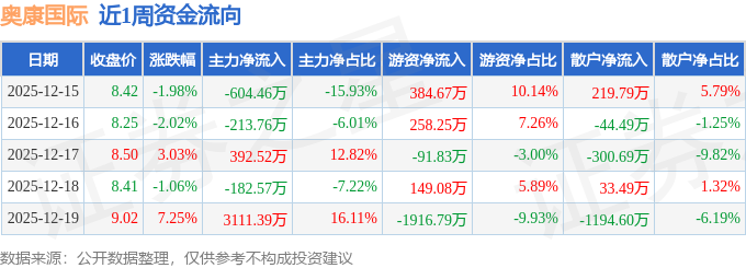 资金流向数据方面,本周奥康国际主力资金合计净流入2503.12万元,游资资金合计净流出1216.63万元,散户资金合计净流出1286.49万元。本周资金流向一览见下表: