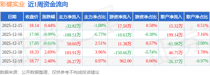 资金流向数据方面,本周彩蝶实业主力资金合计净流出40.55万元,游资资金合计净流出132.31万元,散户资金合计净流入172.86万元。本周资金流向一览见下表: