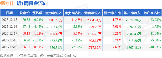资金流向数据方面,本周德力佳主力资金合计净流入1545.8万元,游资资金合计净流入7986.31万元,散户资金合计净流出9532.1万元。本周资金流向一览见下表:
