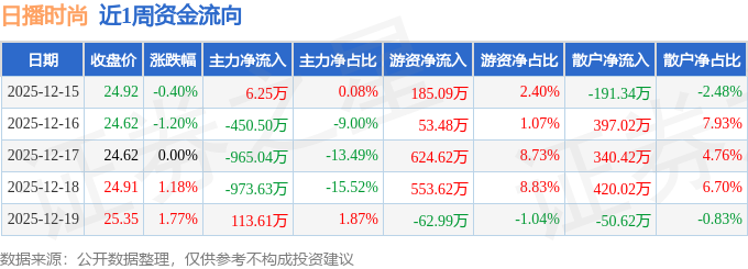 资金流向数据方面,本周日播时尚主力资金合计净流出2269.31万元,游资资金合计净流入1353.81万元,散户资金合计净流入915.5万元。本周资金流向一览见下表: