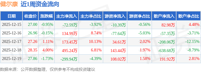 资金流向数据方面,本周健尔康主力资金合计净流入431.16万元,游资资金合计净流入198.04万元,散户资金合计净流出629.2万元。本周资金流向一览见下表: