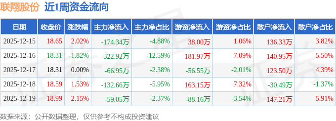 资金流向数据方面,本周联翔股份主力资金合计净流出755.92万元,游资资金合计净流入238.4万元,散户资金合计净流入517.52万元。本周资金流向一览见下表: