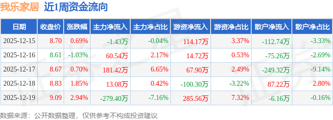 资金流向数据方面,本周我乐家居主力资金合计净流出25.79万元,游资资金合计净流入382.06万元,散户资金合计净流出356.27万元。本周资金流向一览见下表: