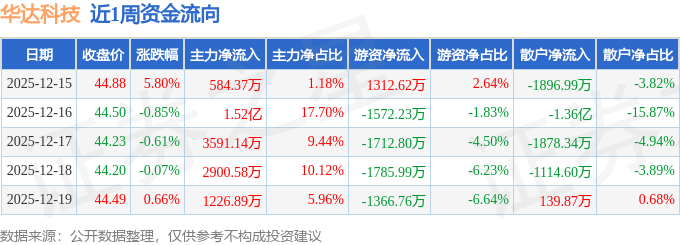 资金流向数据方面,本周华达科技主力资金合计净流入2.35亿元,游资资金合计净流出5125.16万元,散户资金合计净流出1.84亿元。本周资金流向一览见下表: