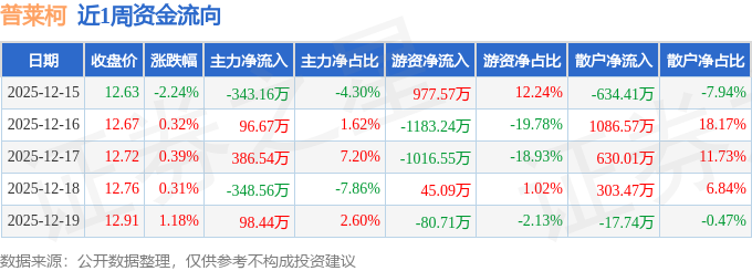 资金流向数据方面,本周普莱柯主力资金合计净流出110.07万元,游资资金合计净流出1257.83万元,散户资金合计净流入1367.91万元。本周资金流向一览见下表: