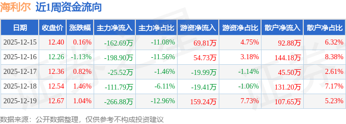 资金流向数据方面,本周海利尔主力资金合计净流出765.78万元,游资资金合计净流入244.38万元,散户资金合计净流入521.41万元。本周资金流向一览见下表: