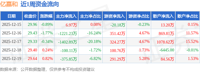 资金流向数据方面,本周亿嘉和主力资金合计净流出3093.11万元,游资资金合计净流入1047.57万元,散户资金合计净流入2045.55万元。本周资金流向一览见下表: