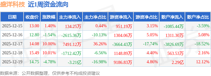 资金流向数据方面,本周盛洋科技主力资金合计净流出2.88亿元,游资资金合计净流入8926.54万元,散户资金合计净流入1.99亿元。本周资金流向一览见下表: