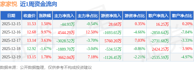 资金流向数据方面,本周家家悦主力资金合计净流入3243.18万元,游资资金合计净流入2434.23万元,散户资金合计净流出5677.41万元。本周资金流向一览见下表: