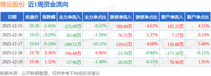 资金流向数据方面,本周雅运股份主力资金合计净流出600.55万元,游资资金合计净流入351.52万元,散户资金合计净流入249.03万元。本周资金流向一览见下表: