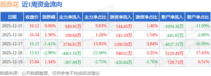 资金流向数据方面,本周百合花主力资金合计净流入517.39万元,游资资金合计净流入2010.11万元,散户资金合计净流出2527.5万元。本周资金流向一览见下表: