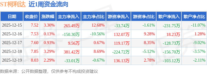 资金流向数据方面,本周ST柯利达主力资金合计净流入473.17万元,游资资金合计净流入128.91万元,散户资金合计净流出602.07万元。本周资金流向一览见下表: