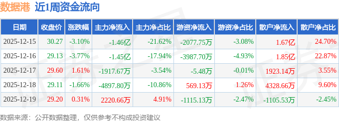 资金流向数据方面,本周数据港主力资金合计净流出3.37亿元,游资资金合计净流出6616.92万元,散户资金合计净流入4.03亿元。本周资金流向一览见下表: