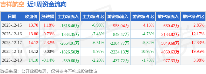 资金流向数据方面,本周吉祥航空主力资金合计净流出7983.82万元,游资资金合计净流出4948.05万元,散户资金合计净流入1.29亿元。本周资金流向一览见下表: