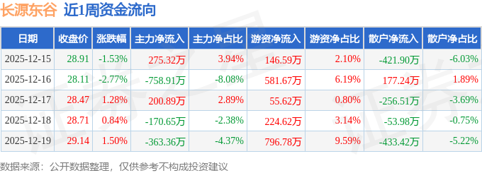 资金流向数据方面,本周长源东谷主力资金合计净流出816.7万元,游资资金合计净流入1805.27万元,散户资金合计净流出988.57万元。本周资金流向一览见下表: