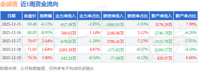 资金流向数据方面,本周金诚信主力资金合计净流入852.71万元,游资资金合计净流入3120.07万元,散户资金合计净流出3972.77万元。本周资金流向一览见下表: