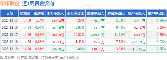 沪深股通持股方面,截止2025年12月19日收盘,华康股份沪股通持股数为48.93万股,占流通股比为16.0%。