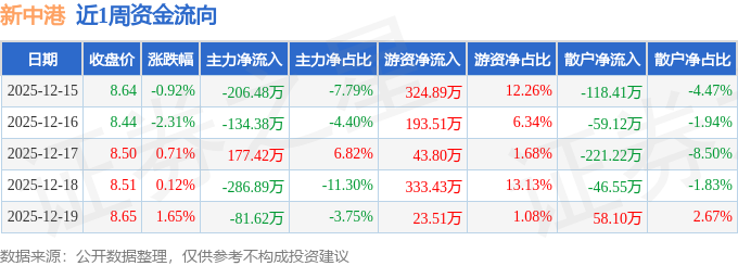 资金流向数据方面,本周新中港主力资金合计净流出531.94万元,游资资金合计净流入919.15万元,散户资金合计净流出387.2万元。本周资金流向一览见下表: