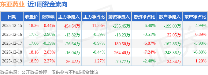 资金流向数据方面,本周东亚药业主力资金合计净流入434.46万元,游资资金合计净流入109.45万元,散户资金合计净流出543.91万元。本周资金流向一览见下表:
