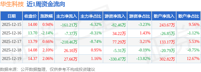 资金流向数据方面,本周华生科技主力资金合计净流出325.29万元,游资资金合计净流出306.73万元,散户资金合计净流入632.02万元。本周资金流向一览见下表: