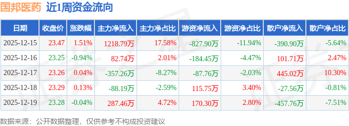 资金流向数据方面,本周国邦医药主力资金合计净流入1143.54万元,游资资金合计净流出814.05万元,散户资金合计净流出329.48万元。本周资金流向一览见下表: