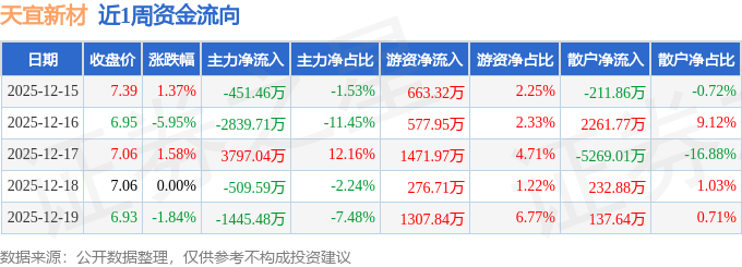 资金流向数据方面,本周天宜新材主力资金合计净流出1449.2万元,游资资金合计净流入4297.79万元,散户资金合计净流出2848.59万元。本周资金流向一览见下表:
