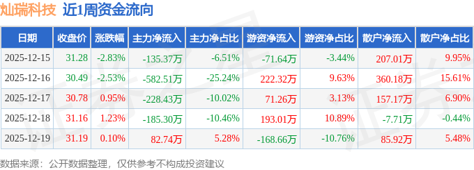 资金流向数据方面,本周灿瑞科技主力资金合计净流出1048.87万元,游资资金合计净流入246.29万元,散户资金合计净流入802.58万元。本周资金流向一览见下表:
