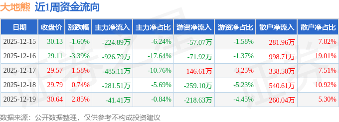 资金流向数据方面,本周大地熊主力资金合计净流出1959.7万元,游资资金合计净流出460.11万元,散户资金合计净流入2419.81万元。本周资金流向一览见下表: