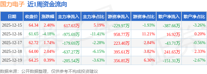 资金流向数据方面,本周国力电子主力资金合计净流出1380.55万元,游资资金合计净流入1704.67万元,散户资金合计净流出324.12万元。本周资金流向一览见下表: