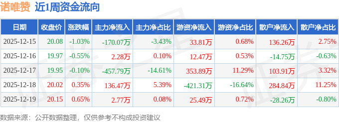 资金流向数据方面,本周诺唯赞主力资金合计净流出486.35万元,游资资金合计净流入4.35万元,散户资金合计净流入482.0万元。本周资金流向一览见下表: