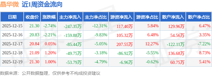 资金流向数据方面,本周晶华微主力资金合计净流出596.22万元,游资资金合计净流入336.39万元,散户资金合计净流入259.83万元。本周资金流向一览见下表: