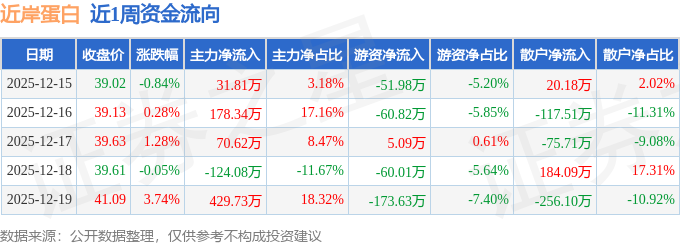 资金流向数据方面,本周近岸蛋白主力资金合计净流入586.41万元,游资资金合计净流出341.35万元,散户资金合计净流出245.06万元。本周资金流向一览见下表:
