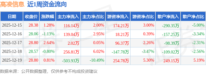 资金流向数据方面,本周高凌信息主力资金合计净流入10.07万元,游资资金合计净流入395.79万元,散户资金合计净流出405.86万元。本周资金流向一览见下表: