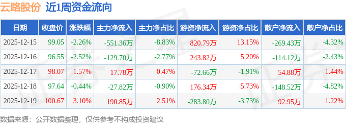 资金流向数据方面,本周云路股份主力资金合计净流出500.26万元,游资资金合计净流入884.49万元,散户资金合计净流出384.24万元。本周资金流向一览见下表: