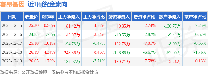 资金流向数据方面,本周睿昂基因主力资金合计净流入152.55万元,游资资金合计净流入45.38万元,散户资金合计净流出197.92万元。本周资金流向一览见下表: