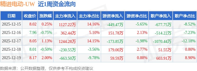 资金流向数据方面,本周精进电动主力资金合计净流入1839.9万元,游资资金合计净流出232.94万元,散户资金合计净流出1606.95万元。本周资金流向一览见下表: