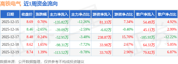 资金流向数据方面,本周高铁电气主力资金合计净流出439.7万元,游资资金合计净流入381.87万元,散户资金合计净流入57.83万元。本周资金流向一览见下表:
