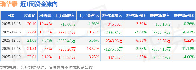 资金流向数据方面,本周瑞华泰主力资金合计净流入1.09亿元,游资资金合计净流入802.93万元,散户资金合计净流出1.17亿元。本周资金流向一览见下表: