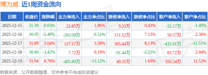 资金流向数据方面,本周博力威主力资金合计净流出450.24万元,游资资金合计净流入424.19万元,散户资金合计净流入26.05万元。本周资金流向一览见下表: