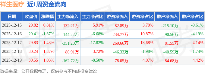 资金流向数据方面,本周祥生医疗主力资金合计净流出439.02万元,游资资金合计净流入619.04万元,散户资金合计净流出180.02万元。本周资金流向一览见下表: