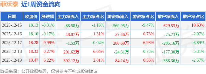 资金流向数据方面,本周菲沃泰主力资金合计净流入481.69万元,游资资金合计净流出186.66万元,散户资金合计净流出295.03万元。本周资金流向一览见下表: